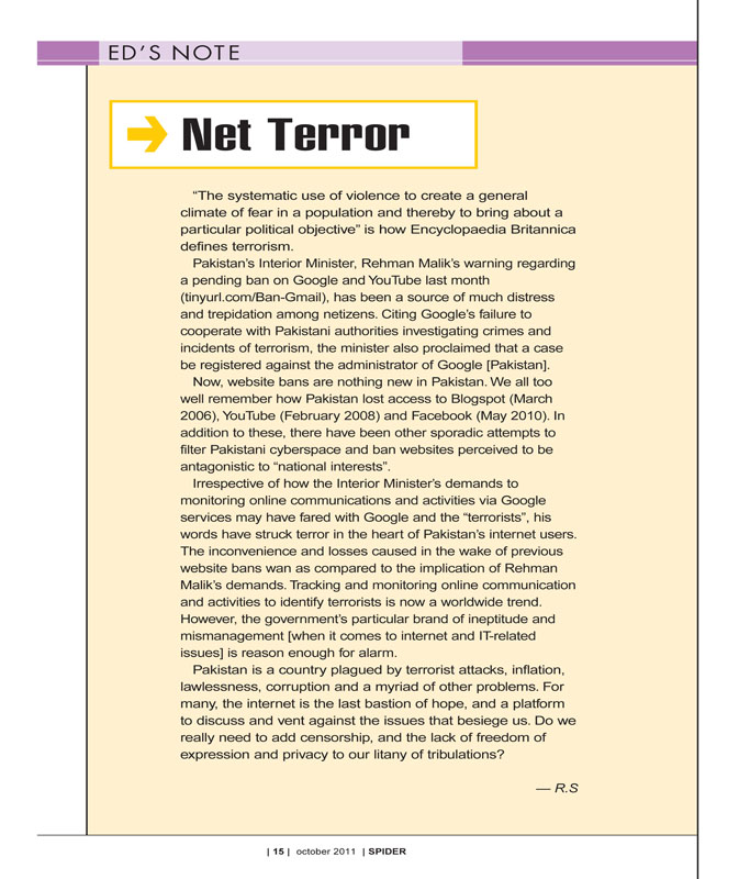 Irrespective of how the Interior Minister’s demands to monitoring online communications and activities via Google services may have fared with Google and the “terrorists”, his words have struck terror in the heart of Pakistan’s internet users. The inconvenience and losses caused in the wake of previous website bans wan as compared to the implication of Rehman Malik’s demands. Tracking and monitoring online communication and activities to identify terrorists is now a worldwide trend. However, the government’s particular brand of ineptitude and mismanagement [when it comes to internet and IT-related issues] is reason enough for alarm.